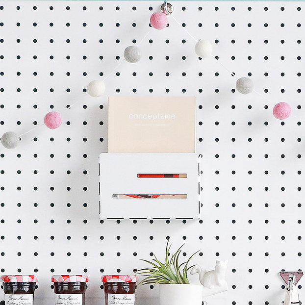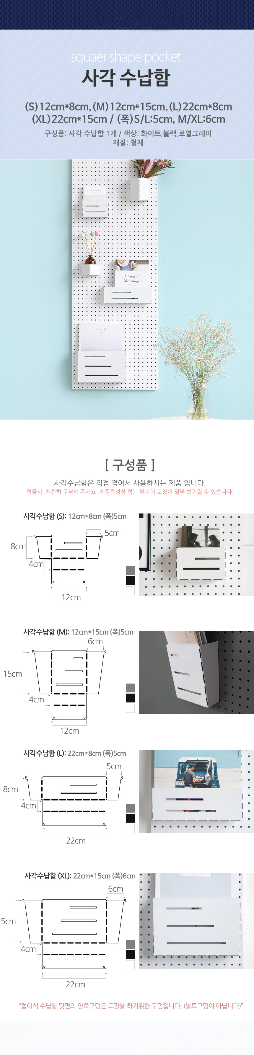 타공판에 수납하는 사각수납함으로 화이트/블랙/그레이 컬러가 있습니다.