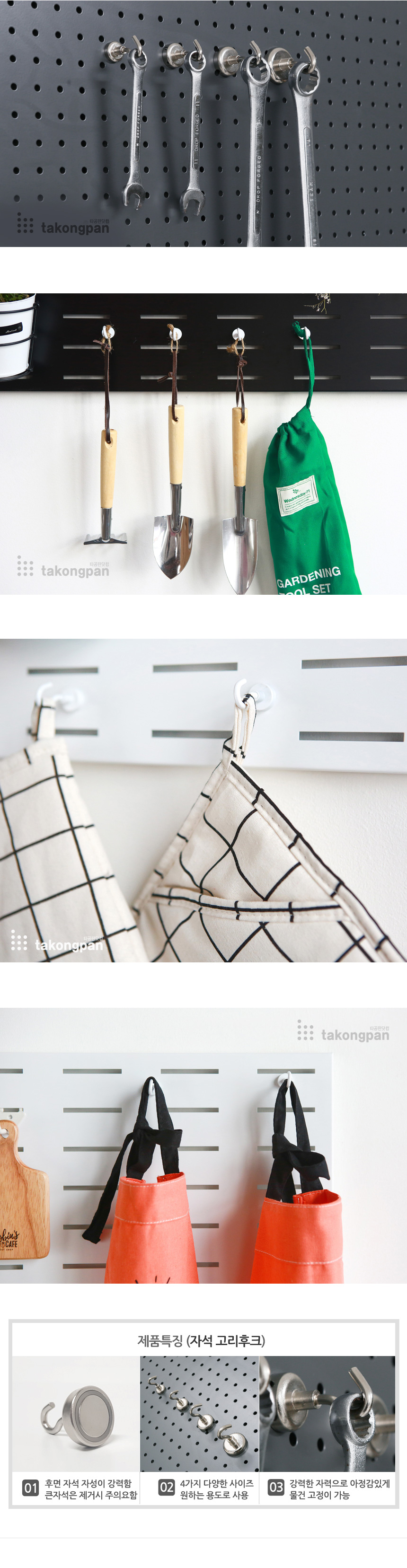 타공판에 자석으로 붙여 사용하는 후크입니다. 컬러는 화이트/블랙/실버 입니다.